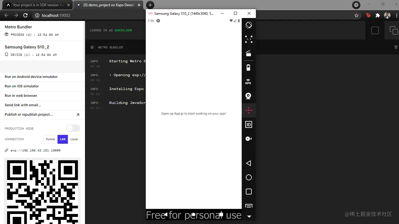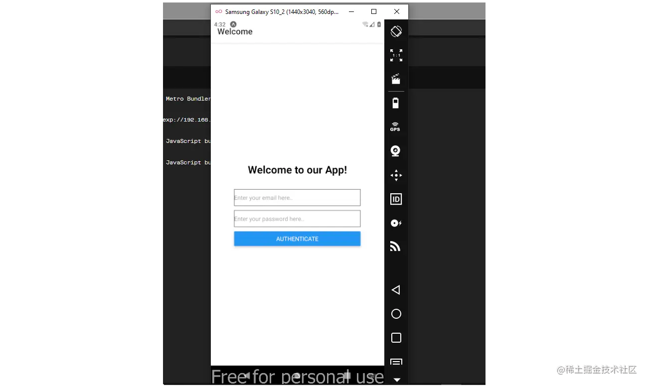 要启动应用程序,请在终端的app目录中使用expo start 。一旦应用程序被启动,你可以使用手机中的expo应用程序扫描条形码并查看应用程序,或者如果你有一个安卓模拟器/IOS模拟器,你可以通过它们从expo开发者工具中打开应用程序,当你启动expo应用程序时,浏览器会打开。对于本文中的图像例子,我们将使用Genymotions来查看我们的结果。下面是我们在Genymotions中的最终结果的样子。