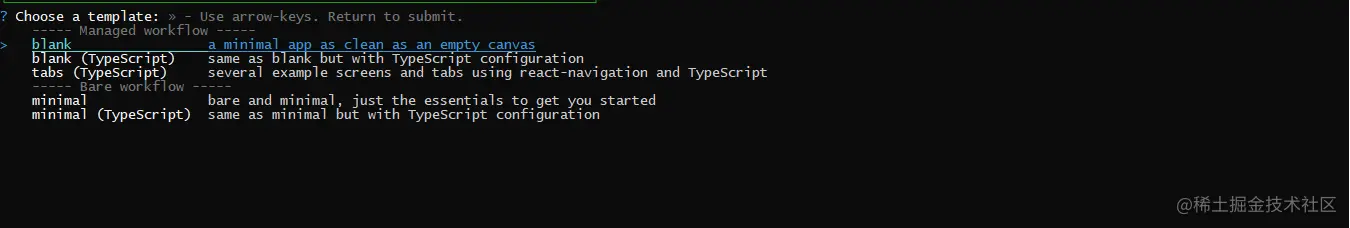 一旦我们的应用程序设置好了,我们就可以把我们的目录改为新的项目目录,并在你最喜欢的代码编辑器中打开它。我们需要安装我们将用于AsyncStorage 的库和我们的导航库。在你的终端中的文件夹目录内,粘贴上面的命令,并选择一个模板(blank 也行)来安装我们的项目依赖。