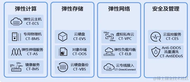 基础设施层是天翼云的基础资源,涉及计算、存储、网络、安全及管理四个部分;