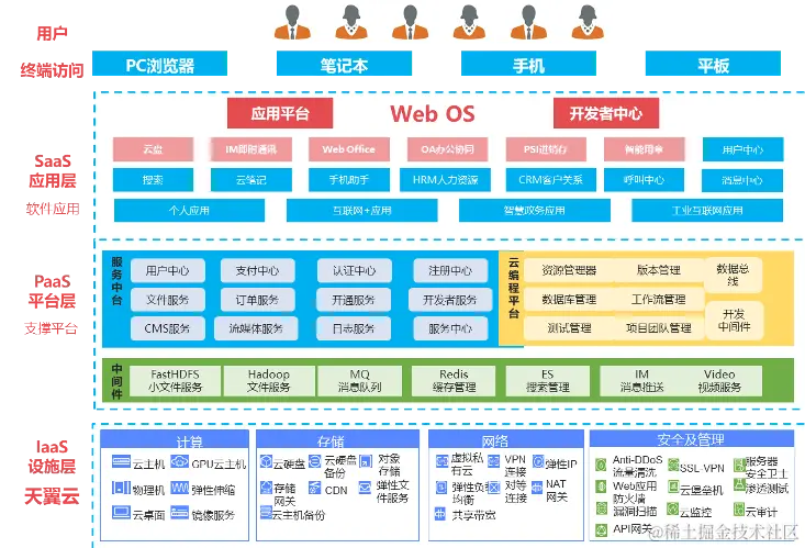天翼云的办公应用平台主要基于四层架构,全方位满足不同企业客户的需求: