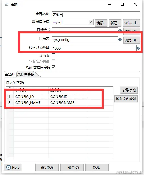 [使用表输出控件]选择数据源,字段映射