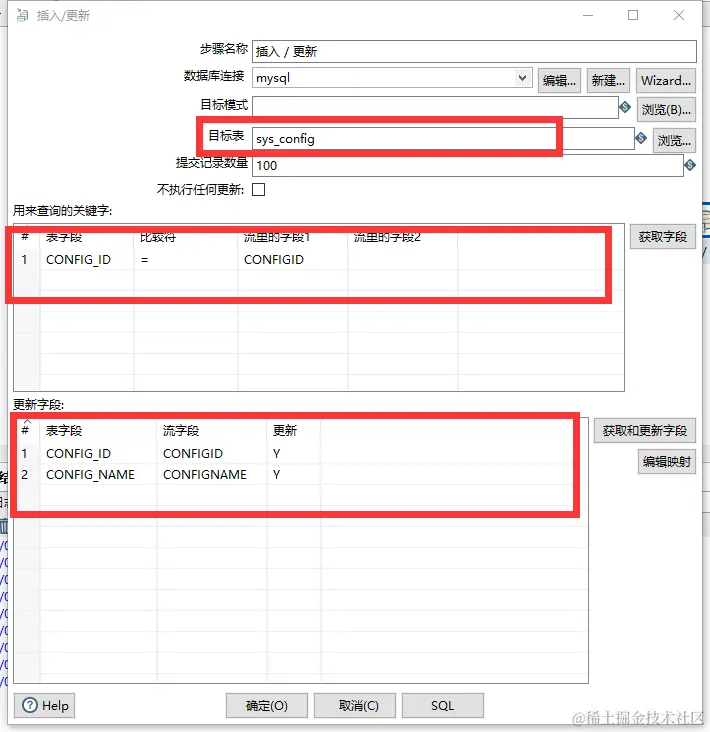 2.[使用插入更新控件] 选择输出中的插入/更新控件,选择数据源,这里可以执行更新(根据什么字段更新,下面选择需要插入更新什么字段)
