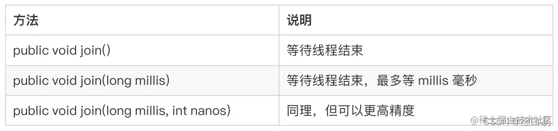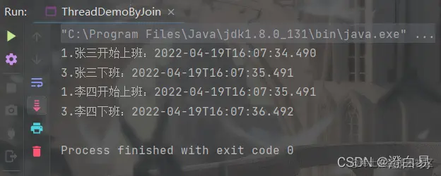 有时,我们需要等待⼀个线程完成它的工作后,才能进行自己的下⼀步工作。例如,李四只有等张三下班了他才上班,这时我们需要⼀个方法明确等待线程的结束。
