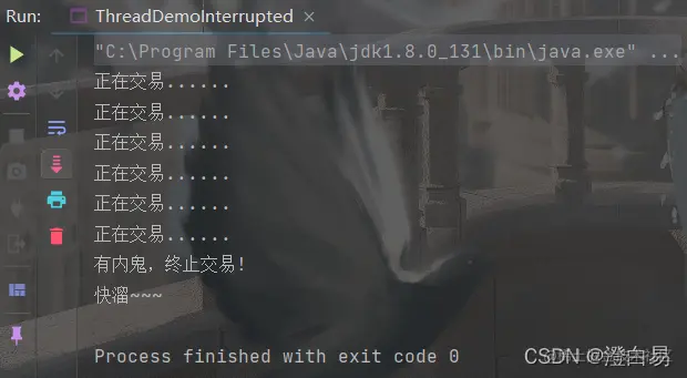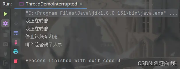 李四⼀旦进到工作状态,他就会按照行动指南上的步骤去进行工作,不完成是不会结束的。但有时我们需要增加⼀些机制,例如老板突然来电话了,说转账的对⽅是个骗子,需要赶紧停止转账,那张三该如何通知李四停止呢?这就涉及到我们的停止线程的方式了。