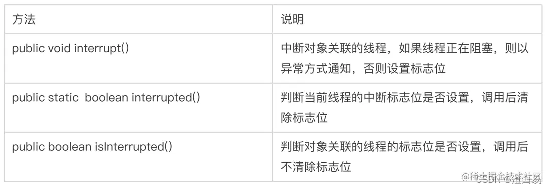 - isInterrupted:判断对象关联的线程的标志位是否设置,调用后不清除标志位。