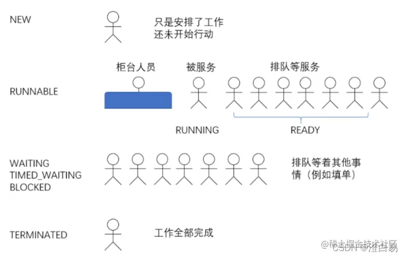 当李四、王五开始去窗口排队,等待服务,就进入到 RUNNABLE 状态。该状态并不表示已经被银行工作⼈员开始接待,排在队伍中也是属于该状态,即可被服务的状态,是否开始服务,则看调度器的调度。