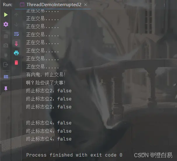 System.out.println("终止标志位4:" + Thread.interrupted());