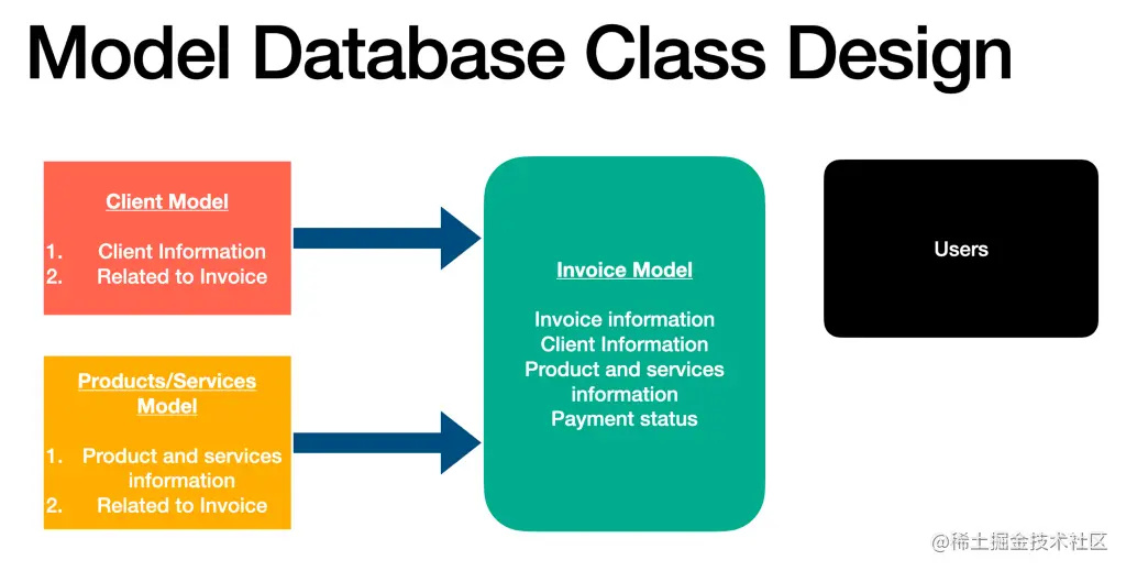 因此,发票模型将有诸如:发票号码、付款状态、付款指示、客户信息和产品信息。