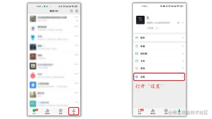 步骤1.点击微信首页右下角的【我】,这里属于我们微信的个人中心设置,我们点击“设置”;