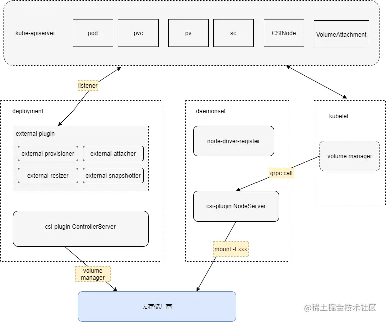 首先 Kubernetes 官方为 CSI 提供了一些辅助服务 external-provisioner、external-attacher、external-resizer、external-snapshotter、node-driver-register、livenessprobe等,通过这些辅助组件 CSI 驱动开发者只需通过实现 CSI 接口和云厂商存储服务通信的内容,便可以方便的开发一个 K8S 存储插件。