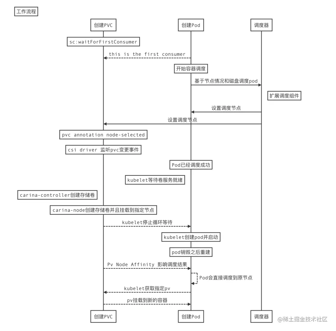 Carina Node:负责维护本地设备,并且执行创建存储卷命令、挂载卷到容器命令等。