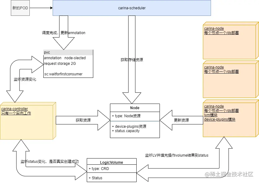 Carina Controller:负责监听 pvc 的创建,并且通知 Carina Node 创建存储卷。