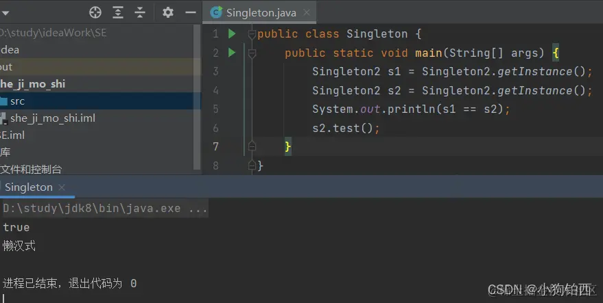 以上是最基础的懒饿汉单例模式的介绍,不难看出饿汉模式占用内存时间长但是相对而言效率较高,懒汉模式占用内存时间短,效率相对低一点(日后学习框架时的懒加载、延迟加载),但是在多线程下,懒汉模式的if判断会存在线程安全性问题,铂西在这里先插个眼,日后学到再补充。