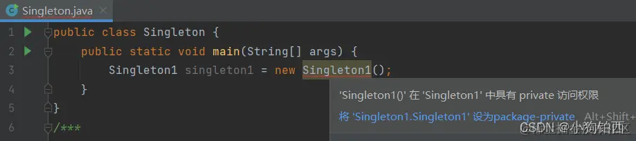 这时再想new一个对象就会报错,因为这个类的构造函数私有化了,无法在外部被创建。