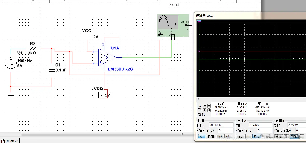 (3)当正端输入(1.25V)比模拟输入低(2V)时,效果如下,此时输出为高(绿色)。