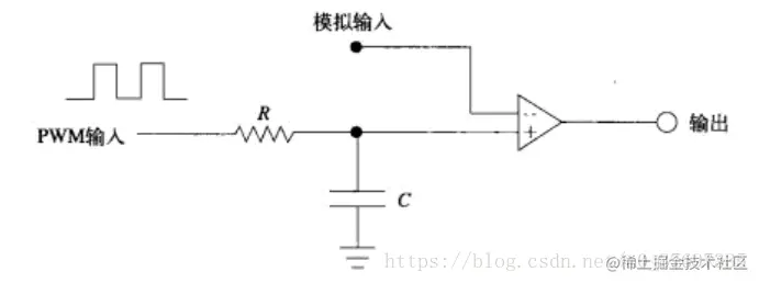 ADC的一个实现原理如下,也就是说利用PWM滤波后得到的电压值作为比较器的正端输入,而模拟输入作为比较器的负端输入,通过判断输出是高还是低,加上不断地改变比较器正端的输入电压(通过改变PWM的占空比),从而界定出模拟输入电压的范围。