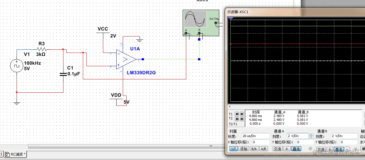 (2)当正端输入(2.5V)比模拟输入高(2V)时,效果如下,此时输出为高(绿色)。