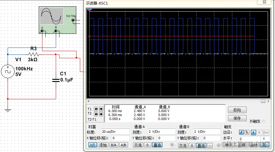 从图中我们可以知道,PWM方波(蓝色)经过RC滤波后,会得到一个直流电压(红色),由于此时PWM的占空比为50%,所以输出电压是PWM高电平的50%,要想改变输出电压的大小,只需要改变PWM的占空比即可(正比关系)。