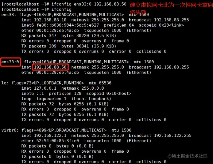 ifconfig ens33:0(可以是任何数字) ip地址 建立虚拟网卡