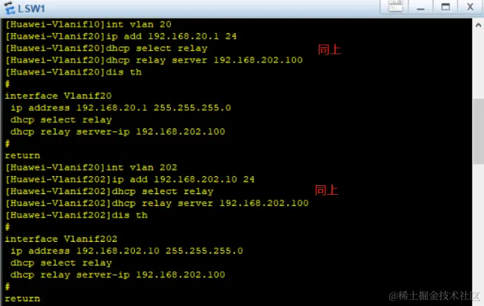 - 在连接不同网段的设备上开启DHCP中继功能,将DHCP这种特殊的广播信息在VLAN之间转发,让其他VLAN的客户机也能从DHCP服务器获得IP地址。