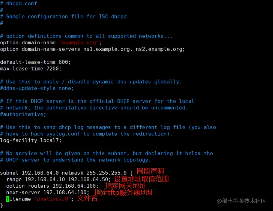 1.编辑DHCP配置文件给同一局域网新加机器分配地址,指明tftp服务器地址