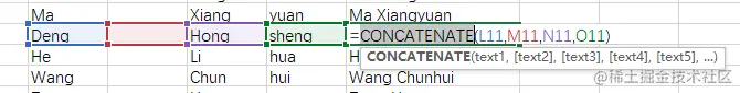 F、使用CONCATENATE(B1,C1,D1,E1)将姓氏与名字合并
