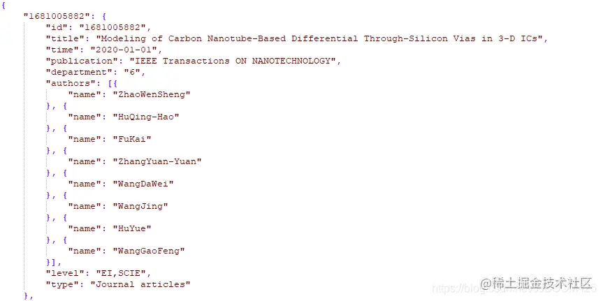 目前需要将mysql中的论文数据转为json格式,但是其中合作作者一列中多个人民通过封号隔开,最后转化样式如下: