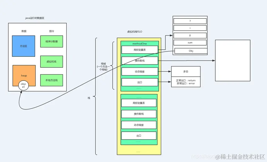 当我们局部变量表中存在Object对象的时候,因为对象存储是在堆中的,所以就会出现栈指向堆的场景
