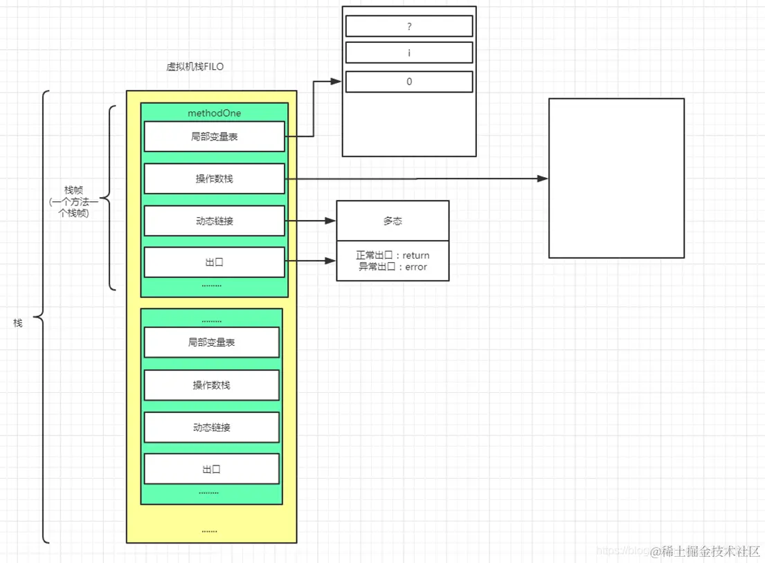 虚拟机栈描述的是 Java 方法执行的内存模型:每个方法在执行的同时都会创建一个栈帧(Stack Frame,是方法运行时的基础数据结构)用于存储局部变量表、操作数栈、动态链接、方法出口等信息。每一个方法从调用直至执行完成的过程,就对应着一个栈帧在虚拟机栈中入栈到出栈的过程。如下图