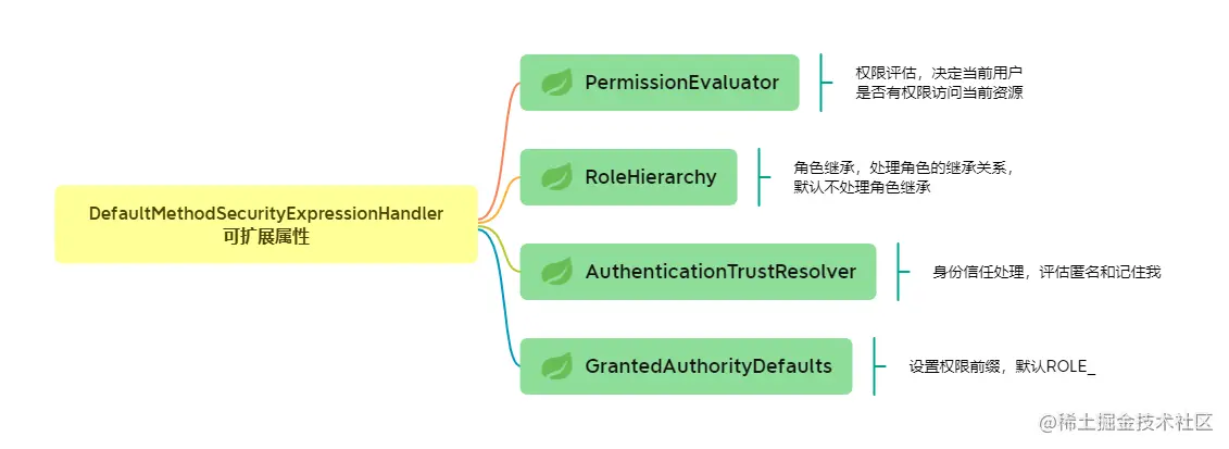 MethodSecurityExpressionHandler 提供了一个对方法进行安全访问的门面扩展。它的实现类DefaultMethodSecurityExpressionHandler更是提供了针对方法的一系列扩展接口,这里我总结了一下: