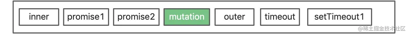 - 执行完outer之后, 我们知道, 除了上面说的微任务, 它也会产生宏任务timeout和setTimeout1, 而这俩, 肯定会在inner产生的宏任务的后面, 所以, outer刚执行完所有微任务时, 任务队列应该是这样: