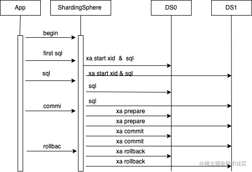 app 执行 commit 命令,transaction 中注册的连接存储 DB 的 connection,分别执行 xa prepare,当所有 connection 返回 ok,更新 transaction 状态为 prepared,每个 connection 执行 xa commit,都返回 ok 更新 transaction 状态为 commited,提交成功。如果 prepare 过程部分失败,用户可以通过 rollback 命令出发回滚,不处理则有后台进程进行清理。