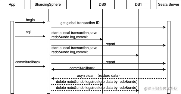 app 执行 commit 命令,Proxy 中的 Seata TM 通知 Seata Server 后,直接返回 app,Seata Server 异步和 Proxy 交互,进行删除事务日志。
