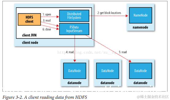 4、Client选取排序靠前的DataNode来读取block,如果客户端本身就是DataNode,那么将从本地直接获取数据;底层上本质是建立Socket Stream(FSDataInputStream),重复的调用父类DataInputStream的read方法,直到这个块上的数据读取完毕;