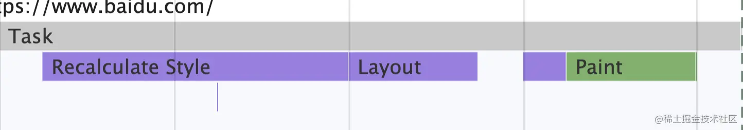 解析完DOM树(蓝色Parse HTML)后,下一个任务是紫色Recaculate Style: