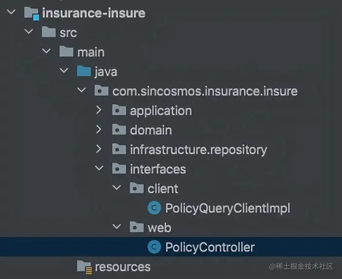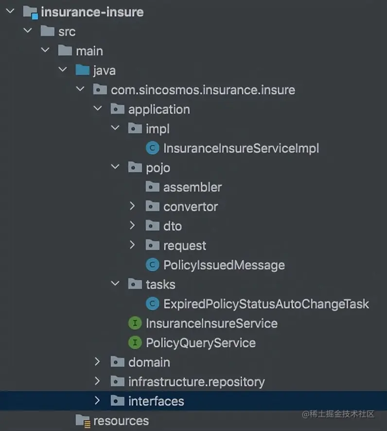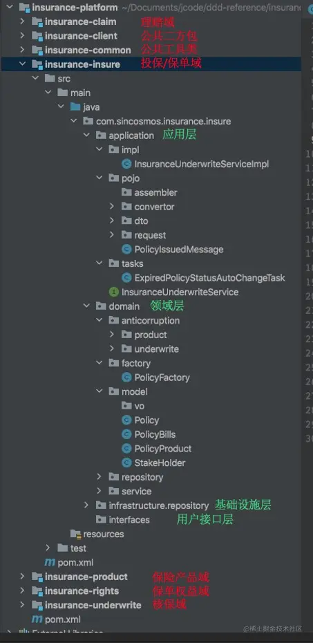 基于上面的分层原则,前述保险领域一个可以参考的代码结构如下,我们将在下面编码示例详细讲解每一个分包的理念和作用。