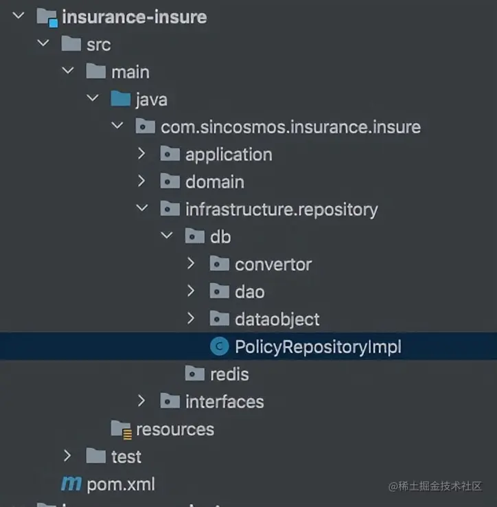 这里只展示了 repository 的实现,但实际上这里还有 RPC 调用的二方包实现类注入等很多内容。上文说到领域层不关心仓储的实现,交由基础设施层负责。基础设施层可以根据需要使用关系型数据库、缓存或者NoSQL,领域层是无感知的。这里我们以关系型数据库为例来,dao 和 dataobject 等都可以使用例如 mybatis generator 等工具生成,领域对象 和 dataobject 之间的转换由 convertor 负责。