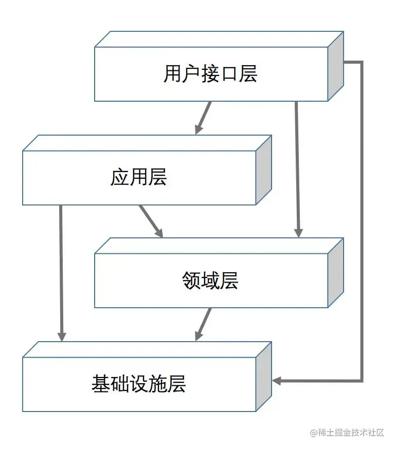 用户接口层所需要的功能实现是由应用层完成,这里一般不需要进行依赖倒置。编码时,该层可以直接引入应用层中定义的接口,因而该层依赖应用层。需要注意的是,虽然理论上用户接口层可以直接使用领域层和基础设施层的能力,但这里建议大家在对这种用法熟练掌握前,最好采用严格的分层架构,即当前层只依赖其下方相邻的一层。
