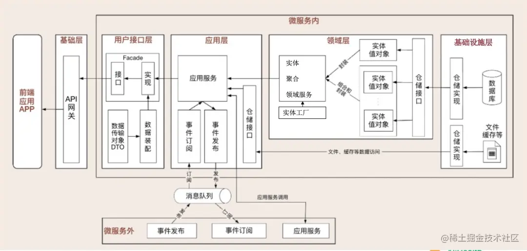 基础设施层为上面各层提供通用的技术能力,例如监听、发送消息的能力,数据库/缓存/NoSQL数据库/文件系统等仓储的 CRUD 能力等。021