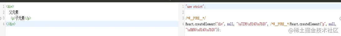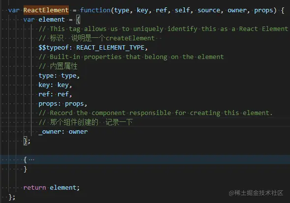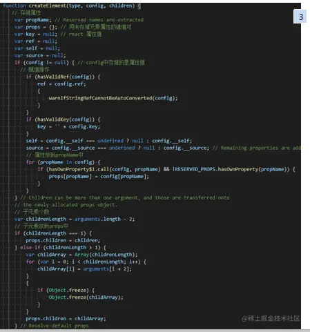 这三个代码片段就是怎么从一个JSX语法转换成VDOM的。再说一下去JSX语法怎么变成React.createElement()方法的,这个编译的动作是通过babel来实现的,babel不单能向后兼容Es5的代码也能转换JSX语法。这个JSX转化成为JS语法的过程说完了。再说一下这个createElement这个方法,从名字就能看出这是用来创建元素的方法,看一下它的源码:
