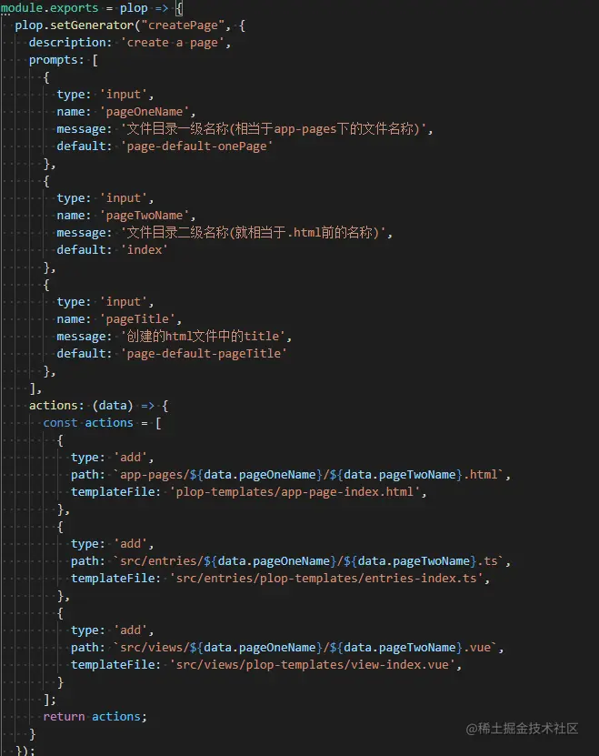 在对应的项目中构建plopfile.js 文件,这个JS文件中会导出一个方法: