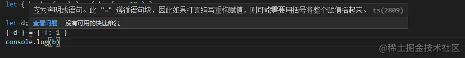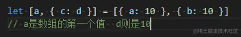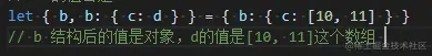 es6数组及对象结构需要注意什么 慢慢来路还长 2022-04-20 175 阅读1分钟 1. 对于已经定义的变量赋值, 这样就会进行提示,语法错误,ts就会提示语法错误,并且应该将这个赋值语句进行括号括起来。 对于对象结构操作时: 从这里可以看出实际上结构操作就是先从对象属性中遍历出相同的属性,然后进行的赋值操作。 复杂对象结构 数组结构:一个个值进行的对应,数组结构的话是进行下标的对应,也可以进行数组中对象进一步结构。