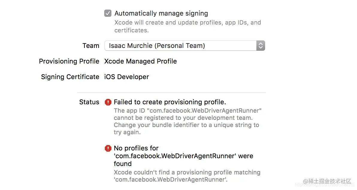 五、Xcode 会创建不了 WebDriverAgentRunner 的 provisioning profile ,如下图: