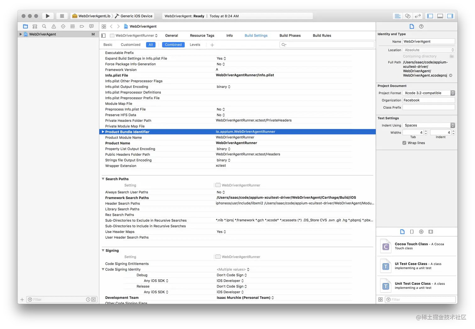 需要在 "Build Settings" tab 里手动改 bundle id。把 "Product Bundle Identifier" 从 com.facebook.WebDriverAgentRunner 改成 Xcode 能采用的 。如图: