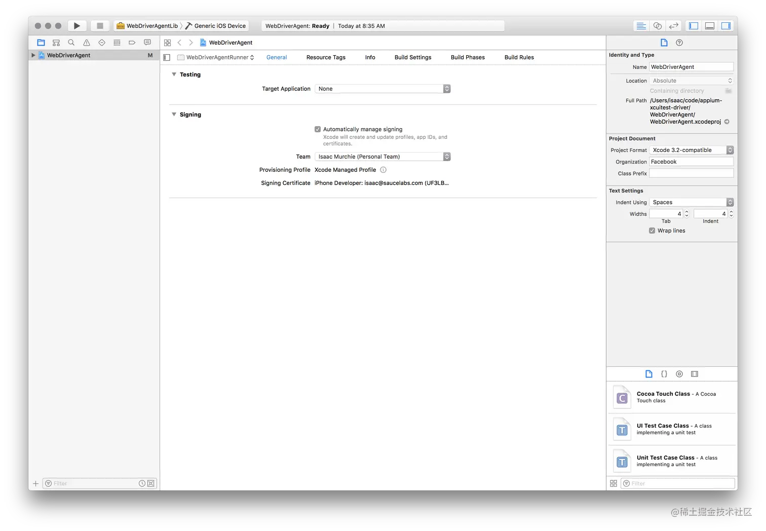 四、用Xcode打开 WebDriverAgent的目录下的 WebDriverAgent.xcodeproj,对于 WebDriverAgentLib 和 WebDriverAgentRunner 两个 target,都选择 "General" tab 里的 "Automatically manage signing" 然后选择你的 Development Team。这也会自动选择 Signing Ceritificate。如图: