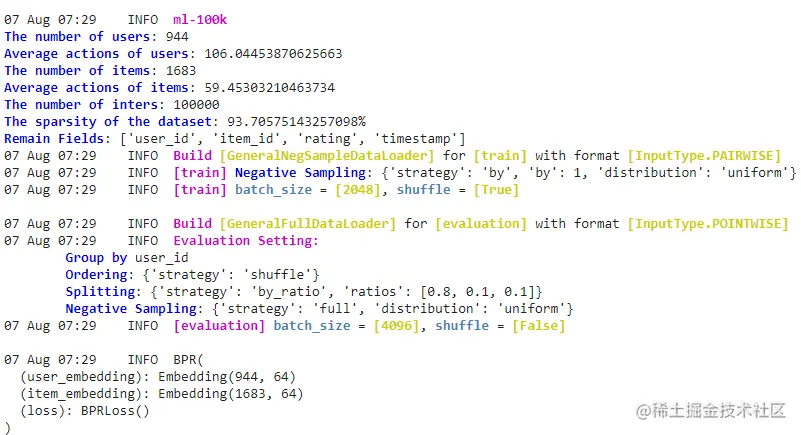 安装完成后,我们可以运行软件包提供的脚本,以实现库的初始使用。这个脚本将在ml-100k数据集中运行BPR模型。这些数据集包括电影标题的发布年份和它们的类别,如惊悚片、动作片、冒险片等,以及它们的唯一ID。