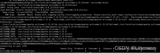 ./activemq dstat,比较有用的一个功能,可以用来查询队列的关键数值,如队列大小,生产者消费者数量,消息出队入队统计等。还可以支持通过类别查询,如只查询队列或者只查询主题。