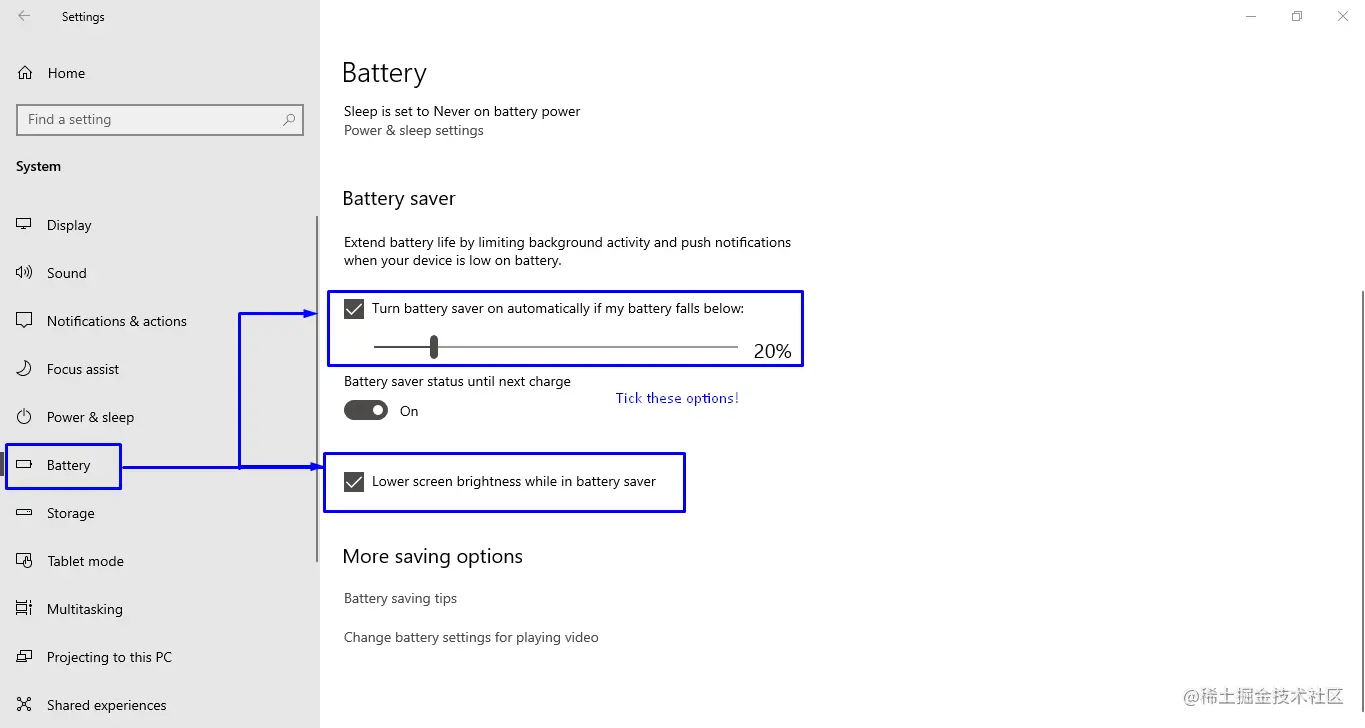 **第4步:**选择 "电池"选项,勾选 "用电池选项降低屏幕亮度"的选项,并设置开启电池保护器的滑块。