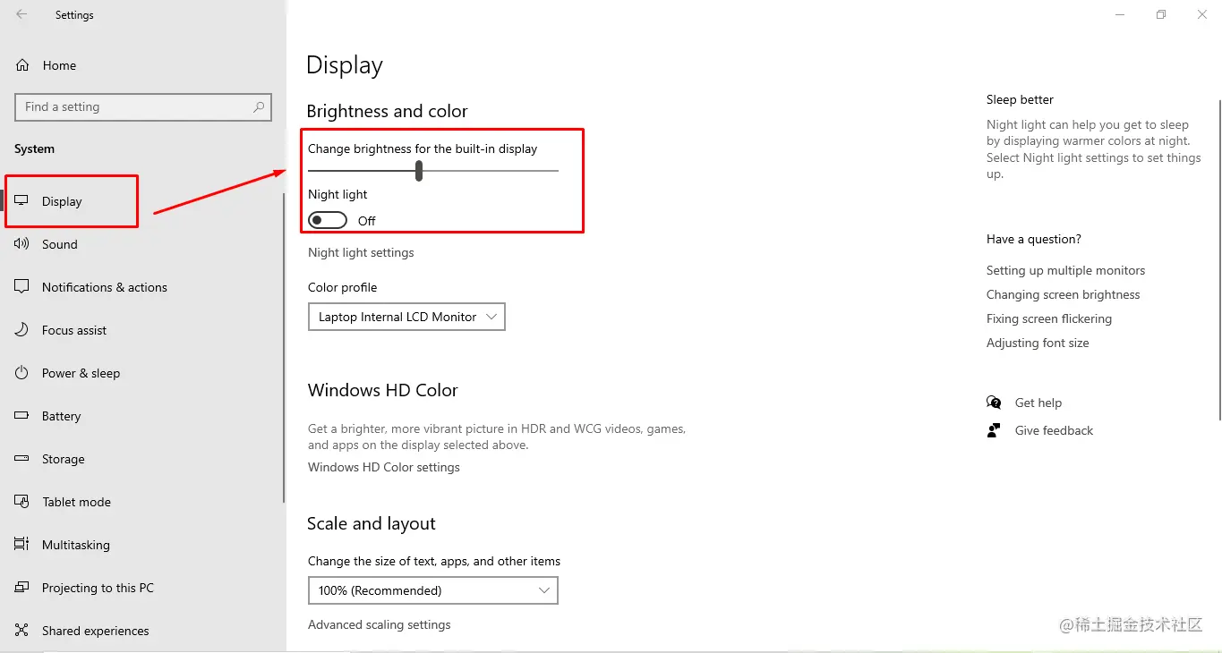 第**3步:**移动到 "显示"选项卡,出现在窗格的左侧,并改变你的内置显示器的亮度水平。