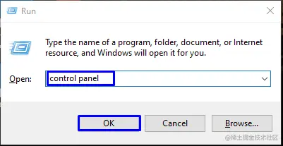 **第1步:**按 "Win+R"打开 "运行"对话框,输入 "控制面板",并点击 "确定"。